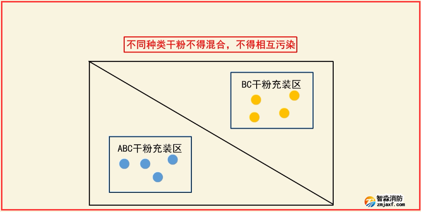 (3)ABC干粉、BC干粉充裝設(shè)備分別獨(dú)立設(shè)置,充裝場(chǎng)地完全分隔開(kāi)。不同種類(lèi)干粉不得混合,不得相互污染。