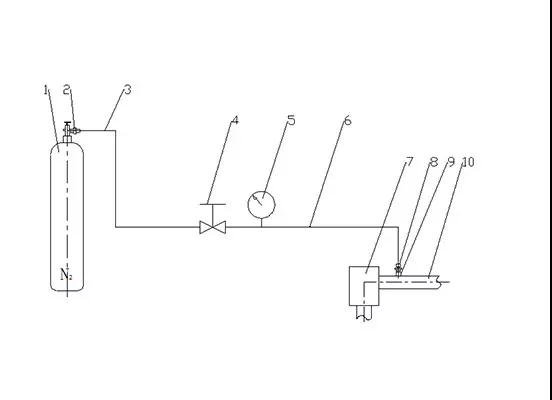 (2)試驗前應先進行預試驗,先將針型閥打開,再緩慢打開氮氣瓶,同時觀察壓力表5的變化情況,當壓力值上升到0.2MPa時,關閉氮氣瓶和針型閥,檢查每個焊接處與螺紋接口處是否有泄漏,如有泄漏,應修復后方可繼續(xù)向管道內(nèi)充氣試壓。