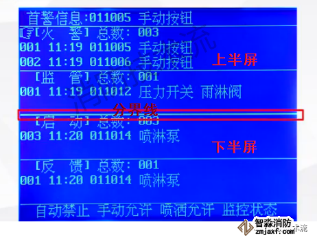 顯示屏分上、下半屏,上半屏為火警、監(jiān)管、故障、屏蔽等屬于報(bào)警信息,下半屏為啟動(dòng)、反饋、動(dòng)作等屬于聯(lián)動(dòng)信息