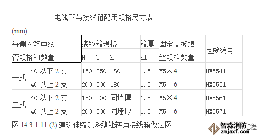 管路在通過建筑物的變形縫時,應加裝管路補償裝置。管路補償裝置是在變形縫的兩側對稱預埋一個接線盒,用一根短管將兩接線盒相鄰面連接起來,短管的一端與一個盒子固定牢固,另一端伸入另一盒內(nèi),且此盒上的相應位置的孔要開長孔,長孔的長度不小于管徑的2倍。如果該補償裝置在同一軸線墻體上,則可有拐角箱作為補償裝置,如不在同一軸線上則可用直筒式接線箱進行補償。做法可參照圖143111?(1)?(2)。也可采用防水型可撓金屬電線管跨越兩側接線箱盒并留有適當余量。