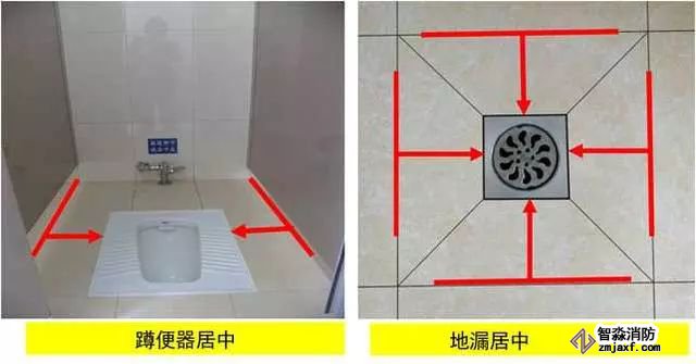 1、衛(wèi)生器具安裝:根據(jù)衛(wèi)生器具規(guī)格、間距及排水管位置進(jìn)行排布,使器具與排水管、配件與墻面磚騎縫或居中。水嘴出水口宜于臺(tái)盆落水口上下對(duì)正。排水管應(yīng)垂直,成排存水彎應(yīng)朝向一致,存水彎與排水管間隙用瀝青麻絲填塞密實(shí)后加不銹鋼裝飾圈,地漏應(yīng)避開(kāi)人上廁所時(shí)常站的地方,且距板塊中間對(duì)稱(chēng)設(shè)置。