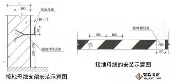 2、配電室接地母線(xiàn):用扁鋼制作接地母線(xiàn)支架,支架末端加工成燕尾形,埋設(shè)深度不小于50mm,出墻平直長(zhǎng)度為10~15mm,上彎立面長(zhǎng)度為40mm。支架安裝間距為1m,離地面高度為300mm。接地母線(xiàn)應(yīng)先調(diào)直或煨彎后焊接在支架上,接地母線(xiàn)搭接長(zhǎng)度大于等于扁鋼寬度的2倍且三面施焊。每房間設(shè)不小于2處的蝴蝶螺母作為臨時(shí)接線(xiàn)柱,過(guò)門(mén)處暗敷埋設(shè),轉(zhuǎn)角用扁鐵煨制圓弧形,煨彎半徑R≥100mm,穿墻板處加設(shè)套管保護(hù)。接地母線(xiàn)應(yīng)刷45°斜向黃綠相間標(biāo)識(shí)油漆,條紋間距100mm,臨時(shí)接線(xiàn)柱兩側(cè)各留20mm寬度不刷漆。