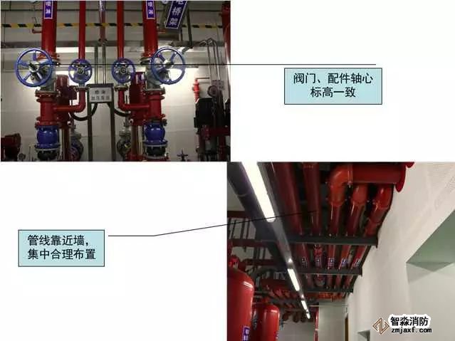 質(zhì)量控制要點(diǎn):成排成線(xiàn),部件標(biāo)高、朝向一致,維護(hù)方便,各專(zhuān)業(yè)必須依照綜合管線(xiàn)布置圖施工(距離管線(xiàn)彎頭500mm范圍內(nèi)應(yīng)設(shè)置支吊架)。