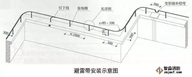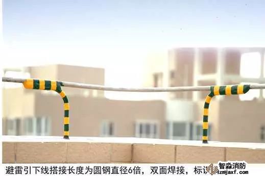 3、圓鋼避雷帶敷設(shè):按設(shè)計(jì)位置彈線(xiàn)、定位,一般情況下,避雷帶應(yīng)居女兒墻(屋脊)中心,當(dāng)女兒墻寬度大于300mm時(shí),支架布設(shè)于距外沿150mm處,距變形縫、轉(zhuǎn)彎300mm處設(shè)支架,直線(xiàn)段支架均勻分布,間距不大于1m;支架埋深不小于80mm,出女兒墻頂面不小于150mm,調(diào)整、校正支架的垂直度,根部套不銹鋼裝飾圈并用耐候膠密封固定。圓鋼調(diào)直后敷設(shè)在支架上,轉(zhuǎn)彎、搭接、變形縫處圓鋼煨彎加工,轉(zhuǎn)彎處?kù)袕澃霃綖?0~100mm,搭接處一端鋼筋煨乙字彎,與另一端圓鋼上下搭接,搭接長(zhǎng)度為100mm,搭接點(diǎn)宜設(shè)在離支架不小于200mm位置處,雙面施焊,焊縫連接飽滿(mǎn),焊渣清理干凈,焊接點(diǎn)應(yīng)先刷防銹漆,再刷銀粉漆,防腐處理到位;變形縫處鋼筋煨成向下半圓形。將防雷引下線(xiàn)可靠焊接在避雷帶上。拉通線(xiàn)校正避雷帶的高度、平直度。