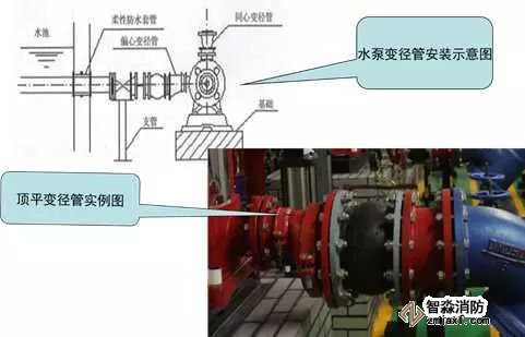 3、水泵吸水、出水變徑管安裝質(zhì)量控制要點(diǎn):水泵吸水口安裝上平偏心大小頭,出水口安裝同心大小頭,螺栓外露長(zhǎng)度不大于螺桿直徑的1/2,且長(zhǎng)度一致。