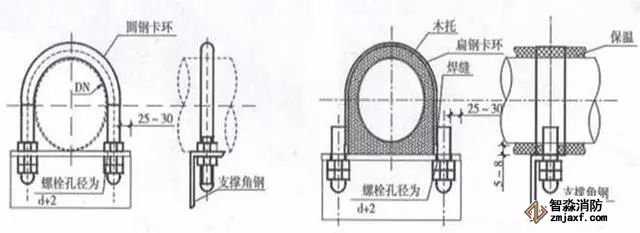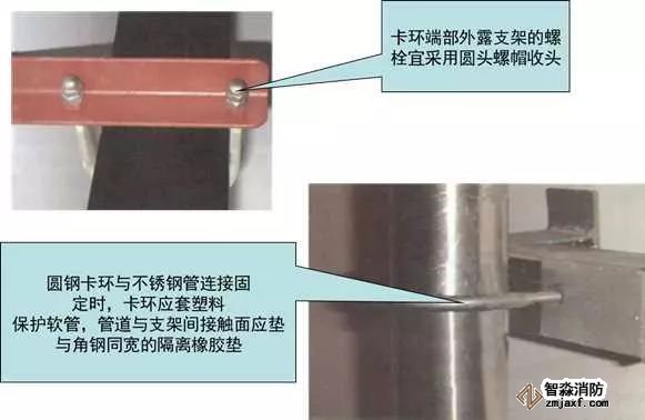 選擇與管徑匹配的卡環(huán),卡環(huán)安裝固定螺栓孔應(yīng)保證管道順直且居卡環(huán)中間,卡環(huán)與管道應(yīng)接觸緊密。圓鋼卡環(huán)與不銹鋼管、銅管連接固定時(shí),卡環(huán)應(yīng)套塑料保護(hù)軟管,管道與支架間接觸面應(yīng)墊與角鋼同寬的隔離橡膠墊。扁鋼卡環(huán)應(yīng)與木托同寬,與螺栓應(yīng)滿(mǎn)焊連接;在與支架連接處應(yīng)垂直,扁鋼端部與支架宜留有5~8mm收縮余量,卡環(huán)端部外露支架的螺栓宜采用圓頭螺帽收頭,油漆涂刷應(yīng)均勻。