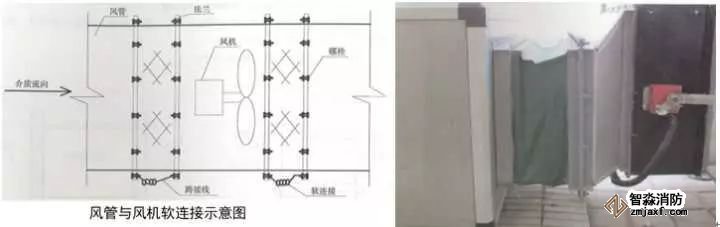 3、風(fēng)管與風(fēng)機(jī)軟連接:確定風(fēng)管與風(fēng)機(jī)之間的距離和同心性,距離要求150~200mm,風(fēng)管、風(fēng)機(jī)同心徑;制作軟接兩端法蘭,中低壓系統(tǒng)法蘭螺栓孔間距120~150mm,高壓及凈化系統(tǒng)距80~100mm,軟接長(zhǎng)度為法蘭間距加20~30mm伸縮量,用鉚釘將軟接均勻平整的固定在法蘭上,鉚釘位置和法蘭螺栓位置對(duì)應(yīng),風(fēng)機(jī)法蘭與風(fēng)管法蘭螺栓孔對(duì)應(yīng),螺栓朝向與介質(zhì)流向一致,螺栓外露長(zhǎng)度為2~3扣絲。屋面與防暴場(chǎng)所采用不小于4mm²的黃綠雙色銅芯軟線(xiàn)壓接銅鼻子接地跨接。成排風(fēng)機(jī)中心線(xiàn)應(yīng)在一條線(xiàn)上。