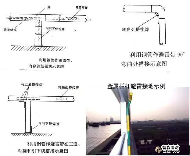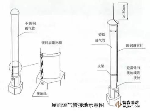 5、屋面金屬通氣管接地:采用鍍鋅扁鋼自屋面避雷網(wǎng)從透氣管根部引出,用抱箍沿透氣管固定,距根部或裝飾臺(tái)面間距300mm,根部與接地線(xiàn)連接,搭接長(zhǎng)度不小于100mm,透氣管的連接部位做接地跨接。