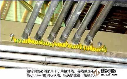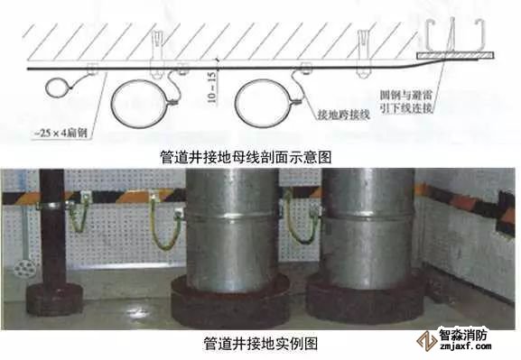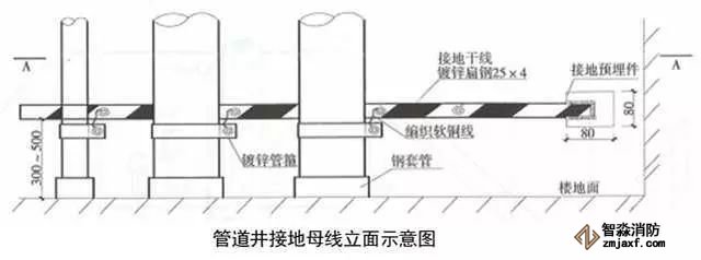 7、高層建筑管道頂部和底部接地:有接地預(yù)埋鋼板或垂直接地母線(xiàn)上引接接地母線(xiàn),接地母線(xiàn)距地300~500mm,距墻10~15mm,并間隔100mm刷45°斜向黃綠相間油漆。將于管徑相匹配的接地抱箍安裝于管道上,抱箍必須與金屬體緊密接觸,編織軟銅線(xiàn)一端與抱箍連接,另一端與接地母線(xiàn)連接,螺栓連接處應(yīng)加平墊片和彈簧墊片。DN≥100mm時(shí),采用10mm²編織軟銅線(xiàn),DN≤80mm時(shí),采用4mm²編織軟銅線(xiàn)。
