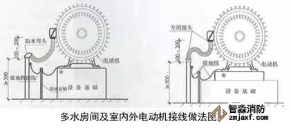 1、電源配管連接:根據(jù)電動(dòng)機(jī)接線(xiàn)盒位置敷設(shè)電源管,成排電動(dòng)機(jī)接線(xiàn)盒宜同向排列。電源敷設(shè)在靠近接線(xiàn)盒的方向,管口離地高度宜≥300mm,低于電動(dòng)機(jī)接線(xiàn)盒中心100~200mm,室外電源管高度與接線(xiàn)盒中心一致,管口安裝防水彎頭。在距管口50~100mm處焊接接地螺栓。軟管管徑應(yīng)與電源管同徑,軟管應(yīng)留有適當(dāng)余量,兩端采用專(zhuān)用管接頭盒專(zhuān)用盒接頭連接。導(dǎo)線(xiàn)壓倒接線(xiàn)盒內(nèi)的接線(xiàn)端子上。電動(dòng)機(jī)底座、電源管應(yīng)與接地母線(xiàn)可靠連接。