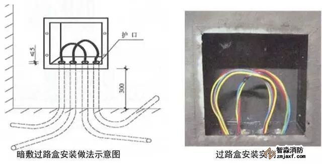 1、過(guò)路接線(xiàn)盒:在導(dǎo)管敷設(shè)時(shí),按照規(guī)范要求在適當(dāng)位置設(shè)置過(guò)路接線(xiàn)盒。過(guò)路盒安裝時(shí)距地高度宜為300mm;在結(jié)構(gòu)板內(nèi)安裝過(guò)路盒時(shí),應(yīng)用扎絲綁緊,盒內(nèi)填充密實(shí),表面用膠帶密封;導(dǎo)管應(yīng)垂直進(jìn)入線(xiàn)盒,焊接管絲頭伸入線(xiàn)盒內(nèi)長(zhǎng)度不大于5mm,盒子內(nèi)外鋼管鎖母上緊,(或KBG、JDG管可用盒接頭與過(guò)路接線(xiàn)盒連接)接地,用φ6圓鋼在焊管間、焊管與過(guò)路盒間進(jìn)行接地跨接;盒內(nèi)穿線(xiàn)應(yīng)留有適當(dāng)余量;管口加護(hù)口;安裝過(guò)路盒面板,面板緊貼墻面或頂面。