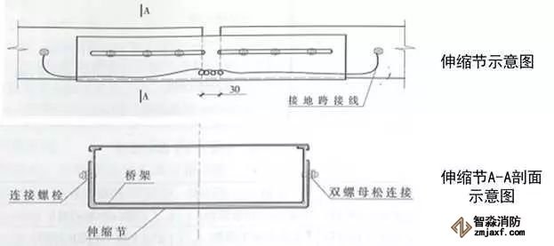 4、伸縮節(jié)安裝:當(dāng)橋架經(jīng)過(guò)建筑伸縮縫或橋架直線(xiàn)長(zhǎng)度大于30m(鋁合金及其他材料直線(xiàn)段長(zhǎng)度大于15m)時(shí),應(yīng)設(shè)置伸縮節(jié),伸縮節(jié)應(yīng)設(shè)置在伸縮縫位置或直線(xiàn)長(zhǎng)度的中間。伸縮節(jié)兩側(cè)各設(shè)置一個(gè)支架,支架與伸縮節(jié)端部距離不大于500mm。伸縮節(jié)補(bǔ)償收縮襯板應(yīng)設(shè)在伸縮節(jié)外側(cè),襯板螺栓孔應(yīng)開(kāi)成條形孔,襯板長(zhǎng)度為兩個(gè)連接板長(zhǎng)度之和加30mm,雙螺母應(yīng)位于橋架外側(cè),且不能擰緊,以保證自由伸縮。伸縮節(jié)兩端橋架應(yīng)采用軟銅線(xiàn)做接地跨接,接地線(xiàn)中間應(yīng)留有余量。