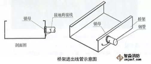 3、橋架進(jìn)出線(xiàn)管:根據(jù)出線(xiàn)口位置,在橋架側(cè)面開(kāi)孔,一管一孔。管端套5~6扣絲,與橋架連接內(nèi)外側(cè)采用鎖母固定,管口伸入橋架內(nèi)不大于5mm,導(dǎo)管與橋架采用不小于4mm²的軟銅線(xiàn)接地跨接。