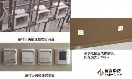 2、成排開(kāi)關(guān)插座盒安裝:根據(jù)結(jié)構(gòu)500mm線(xiàn)和結(jié)構(gòu)墻面線(xiàn),確定成排線(xiàn)盒的高度及位置,墻內(nèi)主筋上做標(biāo)記,上下用兩根鋼筋穿接線(xiàn)盒,兩側(cè)加短鋼筋與結(jié)構(gòu)立筋焊接定位,盒口與模板面平齊,固定端正牢靠,間距均勻。