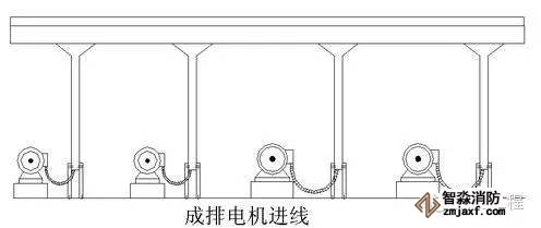 5.機(jī)房因?yàn)樵O(shè)備多,管線及橋架縱橫交錯(cuò),施工時(shí)應(yīng)盡量做好綜合布置,成排電機(jī)橋架進(jìn)線示意如圖: