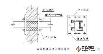 7.封閉插接母線在穿過(guò)墻及防火樓板時(shí),在母線周圍填充防火堵料,具體做法見(jiàn)上圖。