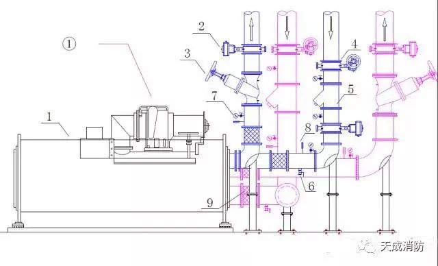 冷水機組常規(guī)接管圖:1-冷水機組,2-電動閥,3-平衡閥,4-蝶閥,5-Y 型過濾器,6-泄水閥,7-壓力表,8-溫度計,9-軟接頭。