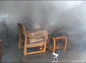 (實驗畫面顯示,火災(zāi)發(fā)生后,獨立感煙探測器開始報警,簡易噴淋開始噴水)