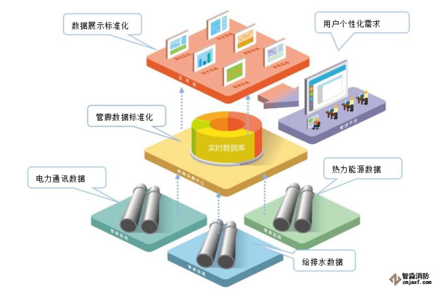 井下所有的信息都要傳到平臺監(jiān)控中心,而監(jiān)控中心的各種控制命令則要傳輸?shù)礁鞫喂芾鹊母鞣N設(shè)備上。在此基礎(chǔ)上,用戶可以很順利的處理來自不同設(shè)備及環(huán)境的數(shù)據(jù),滿足末端設(shè)備擴(kuò)展需求。管廊數(shù)據(jù)標(biāo)準(zhǔn)化、數(shù)據(jù)展示標(biāo)準(zhǔn)化、電力通訊數(shù)據(jù)、熱力能源數(shù)據(jù)、給排水?dāng)?shù)據(jù)、用戶個(gè)性化需求,利用物聯(lián)網(wǎng)對地下管廊進(jìn)行感知和識別,通過網(wǎng)絡(luò)互聯(lián)進(jìn)行傳輸、計(jì)算、處理和數(shù)據(jù)挖掘,實(shí)現(xiàn)對地下管廊的實(shí)時(shí)控制、精確管理和科學(xué)決策。