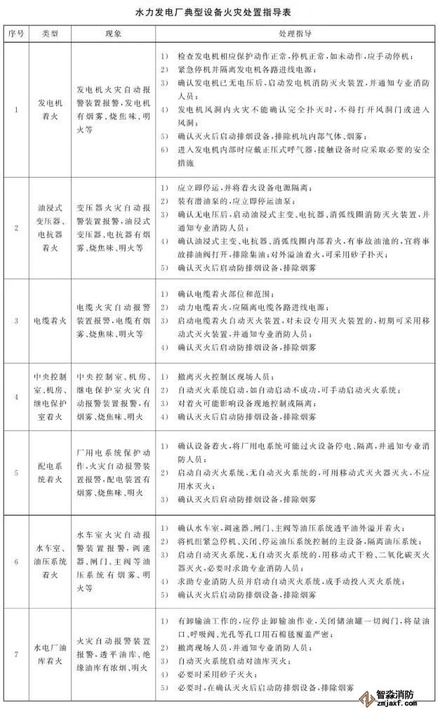 5、水力發(fā)電廠發(fā)生火災(zāi)時,值班人員應(yīng)及時進行火災(zāi)處置并報警,相關(guān)設(shè)備的火災(zāi)處置參見下表。