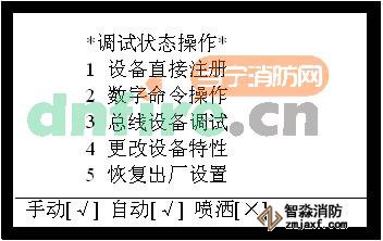 按下“系統(tǒng)設置”按鍵,在系統(tǒng)設置操作狀態(tài)下,鍵入“6”,便進入調(diào)試操作狀態(tài),如圖2所示。調(diào)試狀態(tài)提供了設備直接注冊、數(shù)字命令操作、總線設備調(diào)試、更改設備特性、恢復出廠設置五種操作。