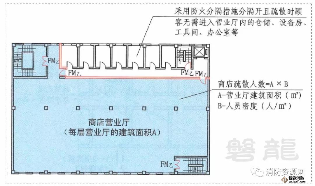 注1:本條所指“營業(yè)廳的建筑面積”,既包括營業(yè)廳內(nèi)展示貨架、柜臺、走道等顧客參與購物的場所,也包括營業(yè)廳內(nèi)的衛(wèi)生間、樓梯間、自動扶梯等的建筑面積。對于進行了嚴格的防火分隔,并且疏散時無需進入營業(yè)廳內(nèi)的倉儲、設(shè)備房、工具間、辦公室等,可不計入營業(yè)廳的建筑面積。