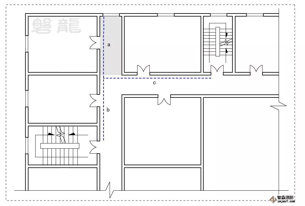 注:本圖示僅有一個(gè)方向能到達(dá)安全出口,不應(yīng)許可。確有需要時(shí),宜按袋形走道處理,按最不利情況下的折返長(zhǎng)度(2a+2b+c)計(jì)算疏散距離。比如,一二耐火等級(jí)的高層教學(xué)建筑:(2a+2b+c)≤15m。