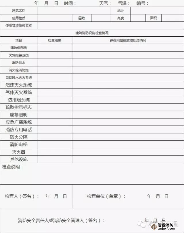 3、情況正常在“檢查結(jié)果”欄中標(biāo)注“正常”;發(fā)現(xiàn)的問(wèn)題或存在故障應(yīng)在“存在問(wèn)題或故障處理情況”欄中填寫(xiě),并及時(shí)處置;當(dāng)場(chǎng)不能處置的要填報(bào)《建筑消防設(shè)施故障處理記錄》;其他需要說(shuō)明的情況在“檢查說(shuō)明”欄填寫(xiě)。