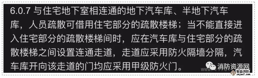 3、與住宅地下室相連通的地下汽車(chē)庫(kù)(或半地下汽車(chē)庫(kù)),汽車(chē)庫(kù)的人員疏散,可借用住宅部分的疏散樓梯,詳見(jiàn)《 汽車(chē)庫(kù)、修車(chē)庫(kù)、停車(chē)場(chǎng)設(shè)計(jì)防火規(guī)范》6.0.7