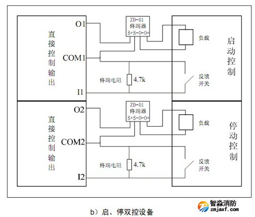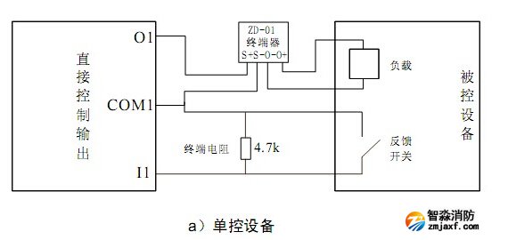 GST-LD-KZ014直接控制輸出與外部被控設(shè)備連接(GST-LD-KZ014控制盤與ZD-01終端器配合使用)如圖所示: