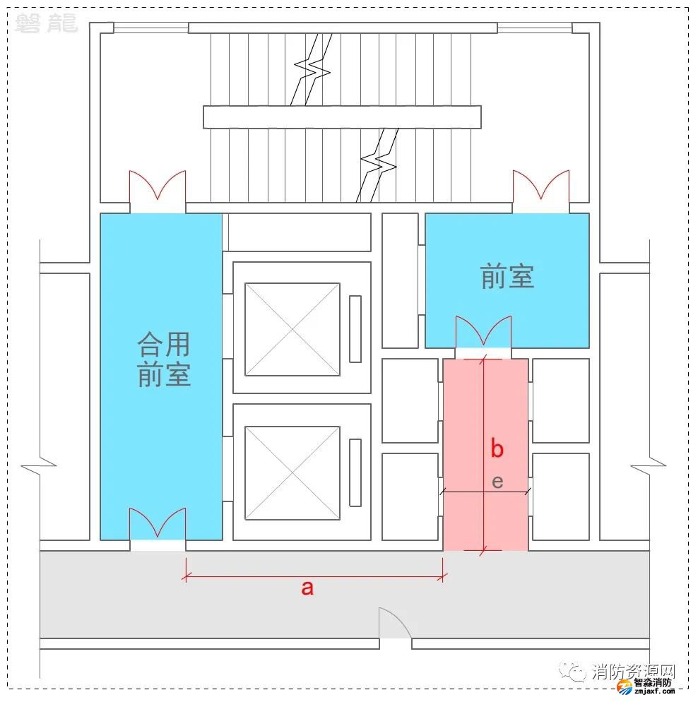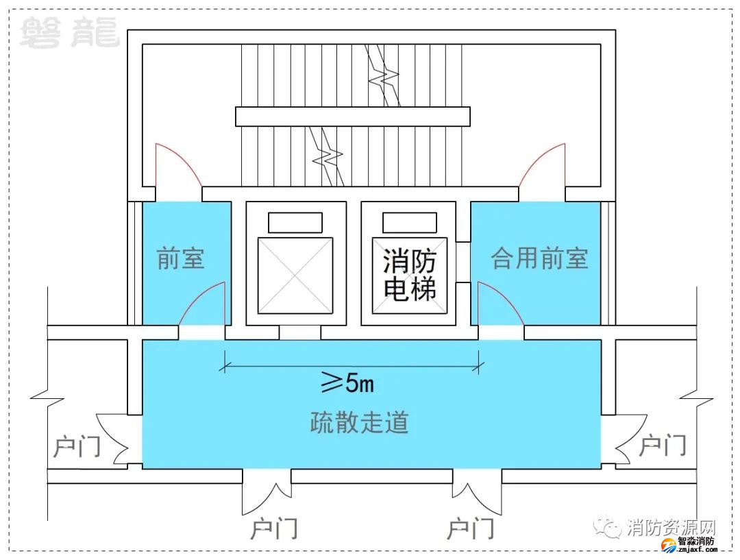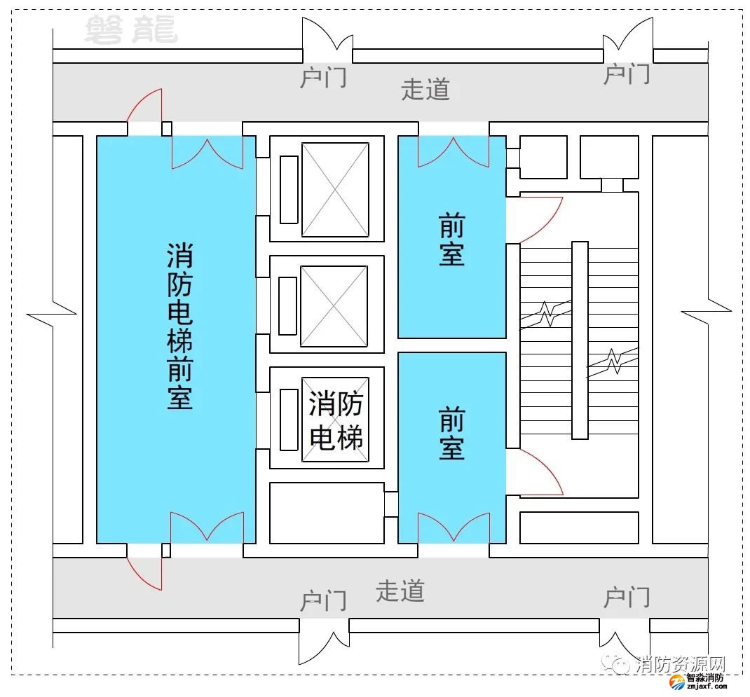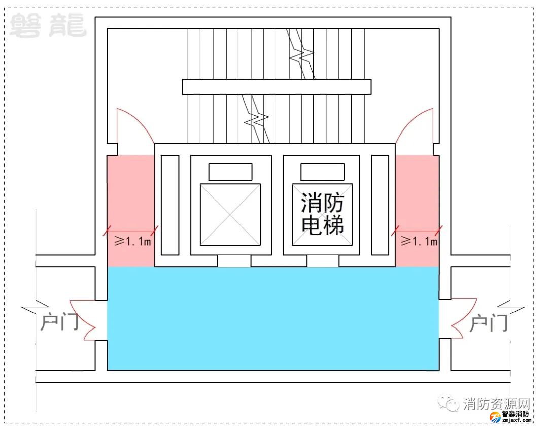 前室應(yīng)該是相對規(guī)則的區(qū)域,特殊情況下,可以有不規(guī)則的擴(kuò)展部分,但應(yīng)確保消防電梯前室規(guī)則區(qū)域的尺寸及面積要求,有疏散功能的通道,其凈寬度應(yīng)計(jì)算確定,并不應(yīng)小于對應(yīng)建筑內(nèi)疏散走道的最小凈寬度要求。