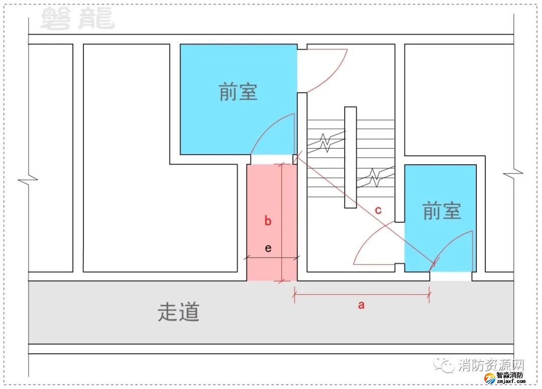 二、“前室穿套”的情況,屬于雙向借用,違反“疏散門應(yīng)向疏散方向開啟”的強(qiáng)條要求:目前的防火門均為“單一方向旋轉(zhuǎn)”,并不存在雙向開啟的防火門。