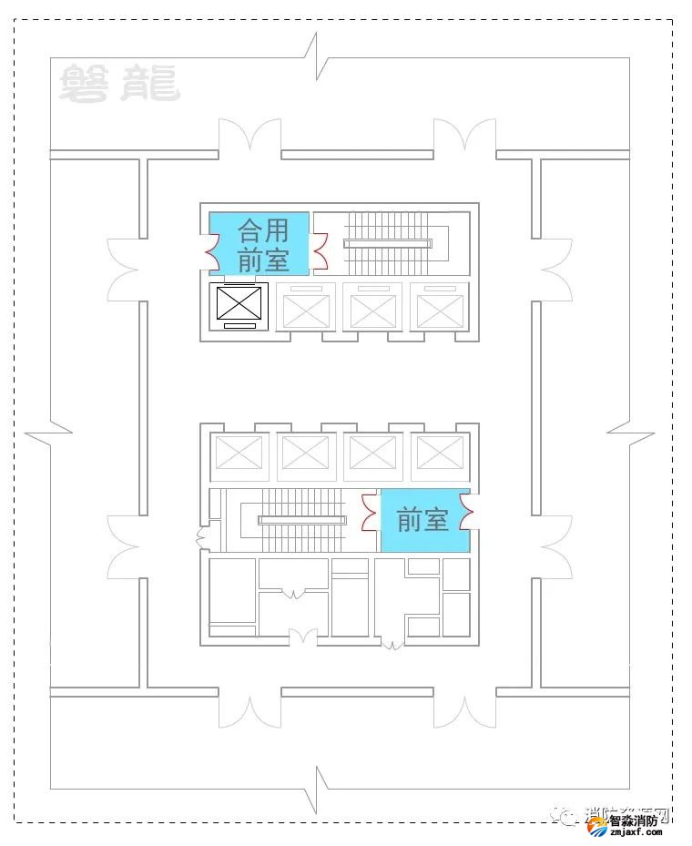 “前室穿套”,也稱“前室套前室”,通常是指通過一個(gè)樓梯間前室(含合用前室)進(jìn)入另一個(gè)樓梯間前室的疏散方式。從疏散路線上講,從一個(gè)前室進(jìn)入了另一個(gè)前室,或者從一個(gè)前室通過走道進(jìn)入另一個(gè)前室,都屬于“前室穿套”。