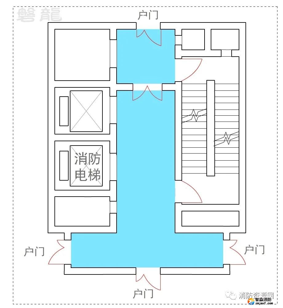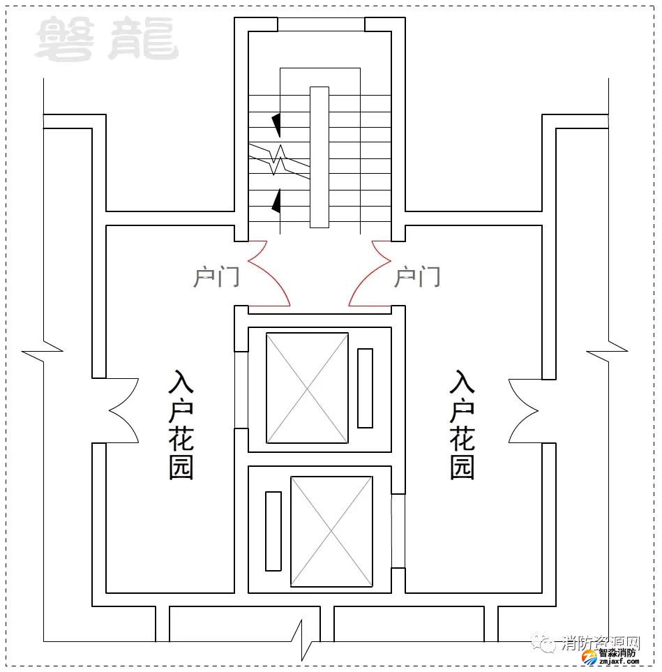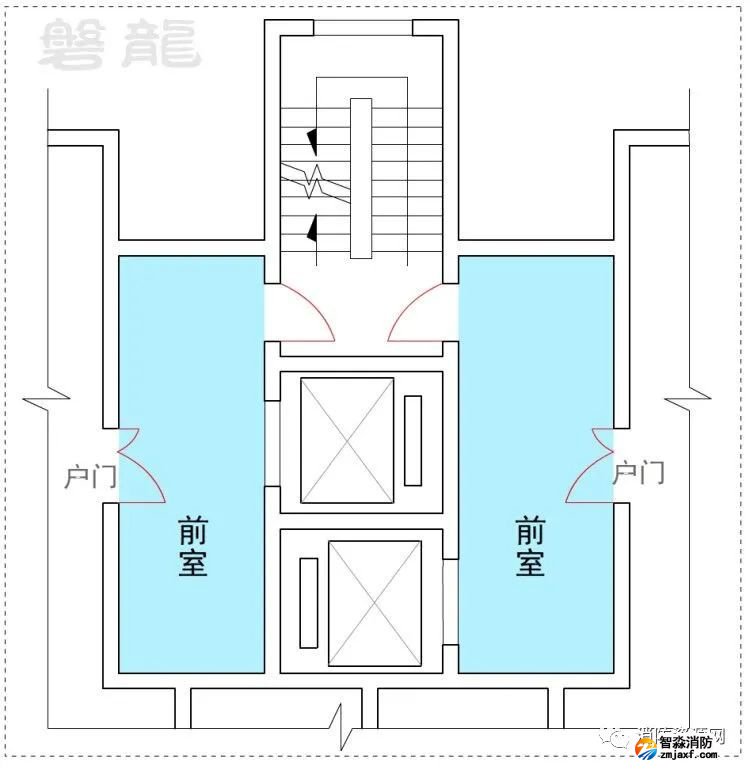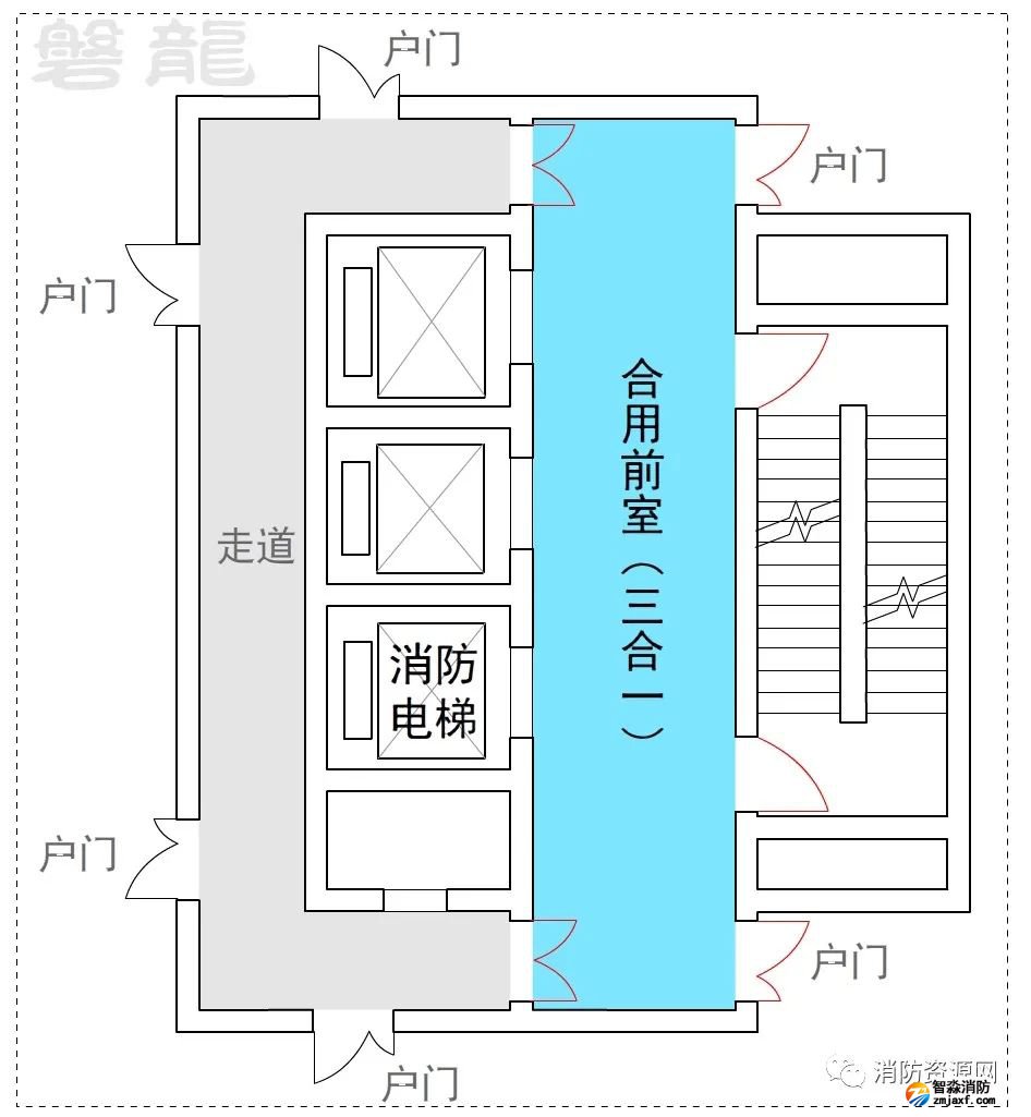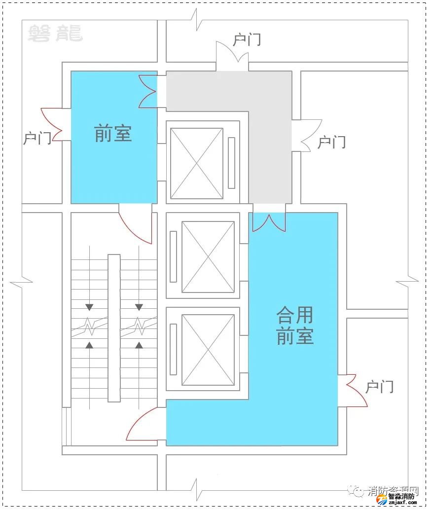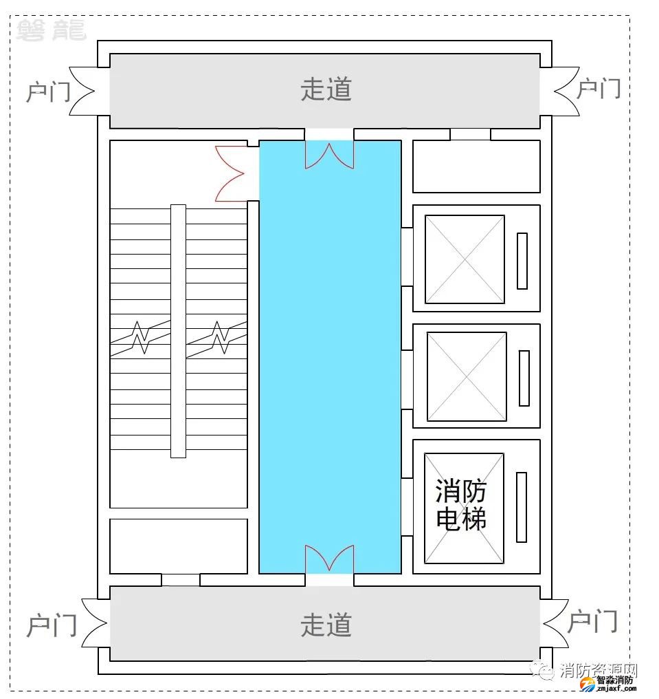 2、許可示例(示例27):本示例中,戶門直接對消防電梯前室開放,也通常認(rèn)為可行:(有爭議)