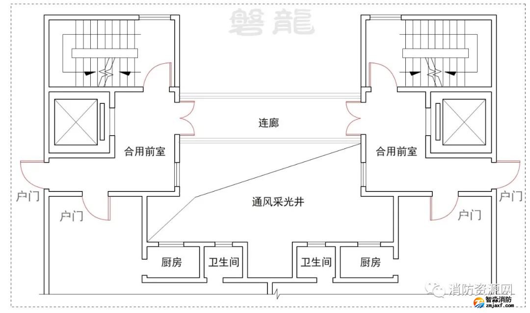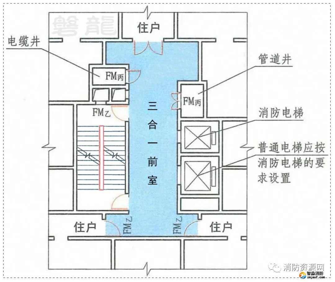 一、滿足一定條件下,擴(kuò)大前室、擴(kuò)大封閉樓梯間可設(shè)置管井(電井)檢查門和客貨電梯(含公共建筑)。