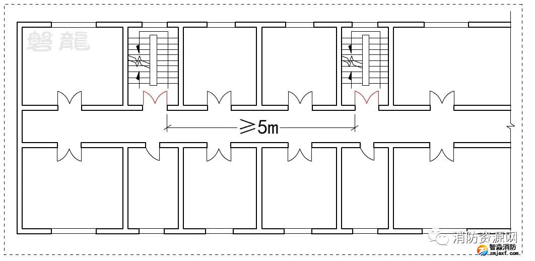 二、T形走道也稱為丁字形走道(示例3),是消防安全疏散設(shè)計(jì)中不可回避的形式。