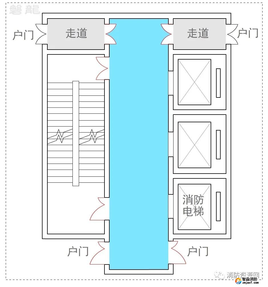 2、正確示例(示例7):本示例開向同一前室的戶門為2樘,其他的戶門通過雙向疏散走道對前室開放: