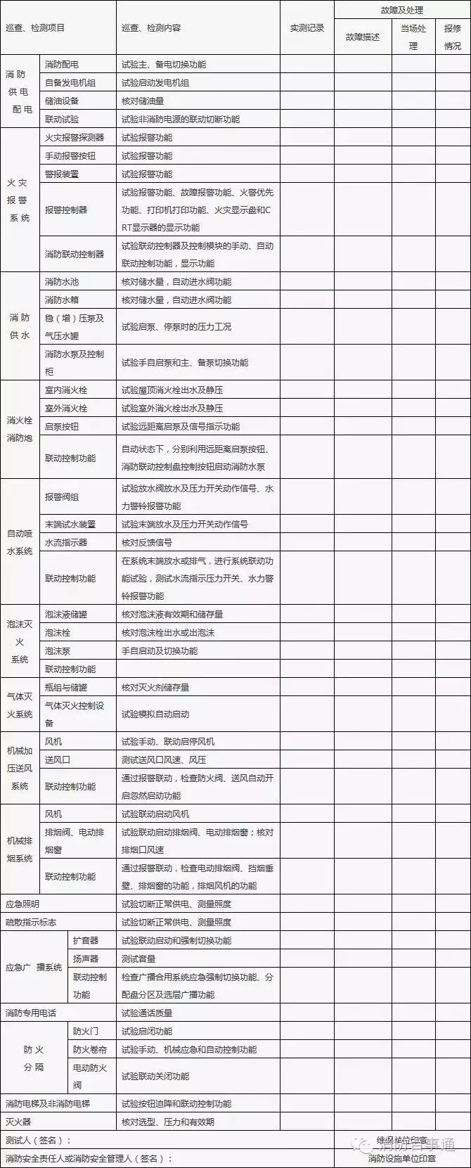3、發(fā)現(xiàn)的問題或存在故障在“實(shí)測記錄”欄中填寫,并及時(shí)處置;當(dāng)場不能處置的要填報(bào)《建筑消防設(shè)施故障處理記錄》。