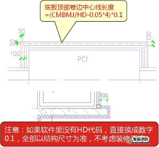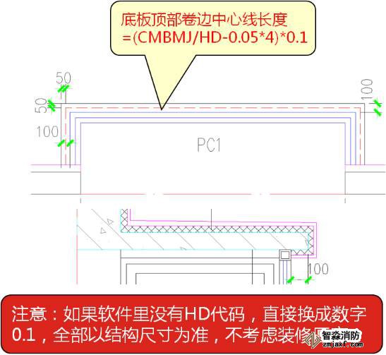 估計很多朋友看不懂“(CMBMJ/HD-0.05*4*0.1”,我解釋下,CMBMJ是飄窗底板側(cè)面模板面積,除以HD(厚度)就是側(cè)面長度,減去0.05*4就是我們要求底板裝修上翻的中心線長度,在乘以0.1就是上翻的面積。