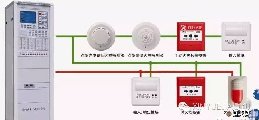 火災(zāi)自動報警系統(tǒng)通常由觸發(fā)裝置如火災(zāi)探測器、報警裝置如火災(zāi)報警控制器、警報裝置如聲光報警器、聯(lián)動控制裝置如總線控制盤與控制模塊、電源等組成。