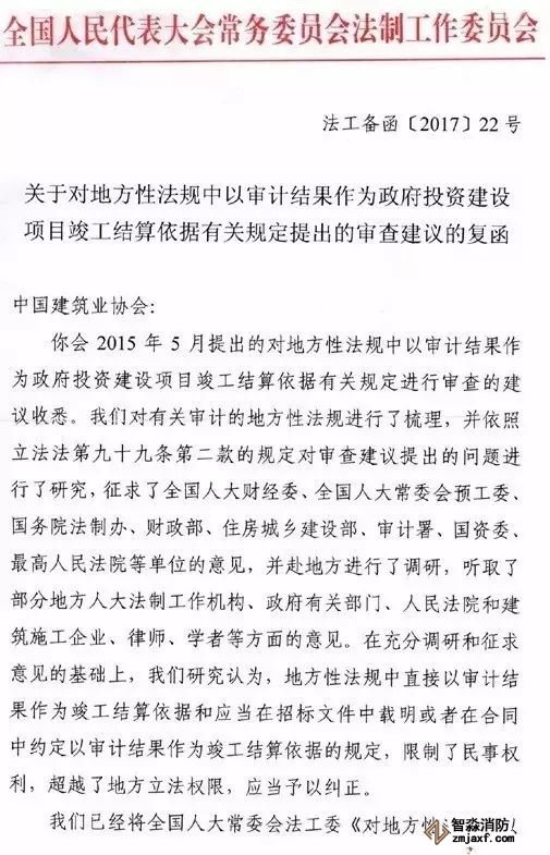 全國人大常委會法工委在回復中國建筑業(yè)協(xié)會《關(guān)于對地方性法規(guī)中以審計結(jié)果作為政府投資建設(shè)項目竣工結(jié)算依據(jù)有關(guān)規(guī)定提出的審查建議的復函》中提出,地方性法規(guī)中直接以審計結(jié)果作為竣工結(jié)算依據(jù)和應當在招標文件中載明或者在合同中約定以審計結(jié)果作為竣工結(jié)算依據(jù)的規(guī)定,限制了民事權(quán)利,超越了地方立法權(quán)限,應當予以糾正。且法工委已將研究意見印送各省、自治區(qū)、直轄市人大常委會。目前,有關(guān)地方人大常委會正在對地方性法規(guī)中的相關(guān)規(guī)定自行清理、糾正。