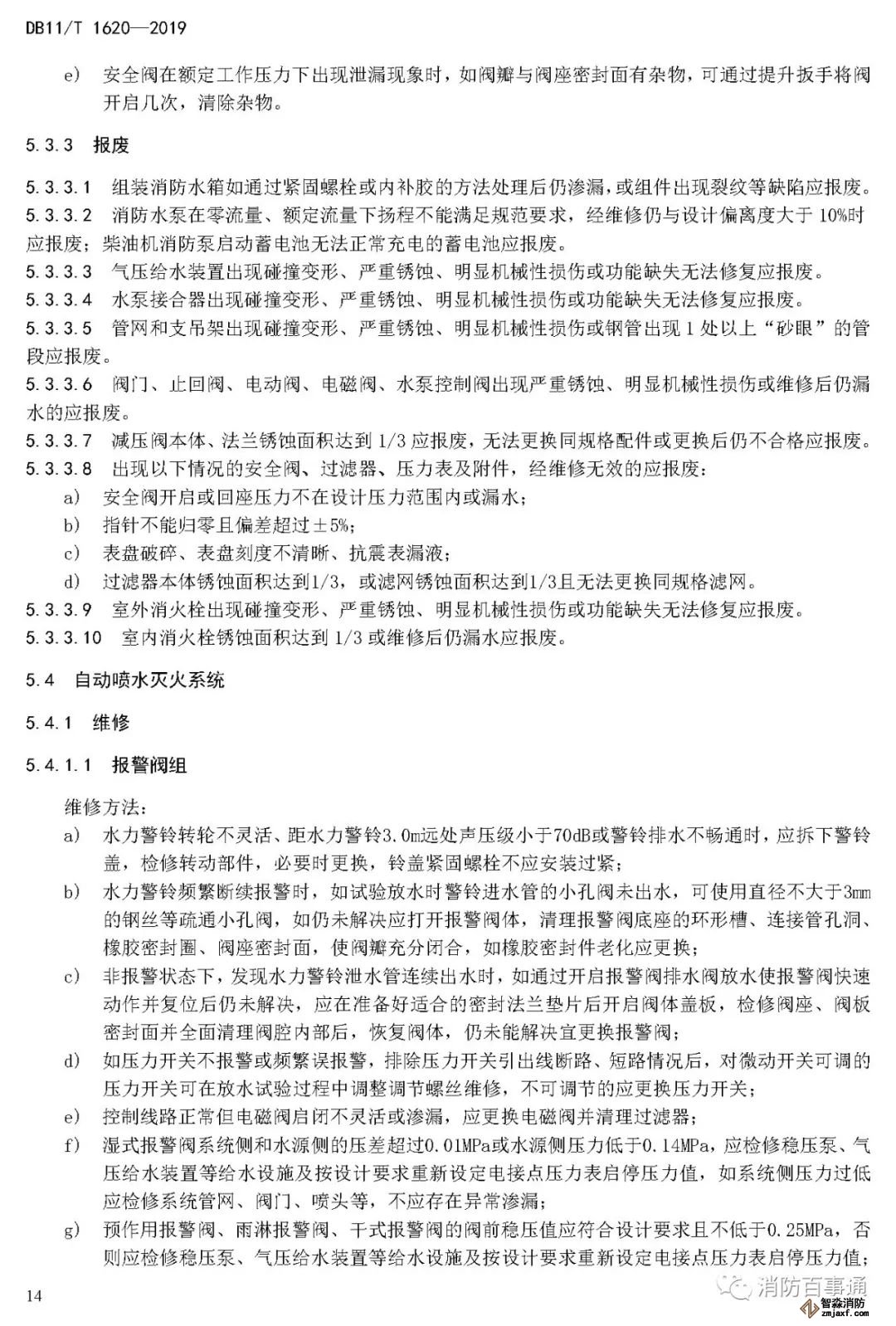 5.4.3.1 報警閥組出現嚴重變形、銹蝕及其他明顯機械性損傷或功能缺失無法修復時應報廢。