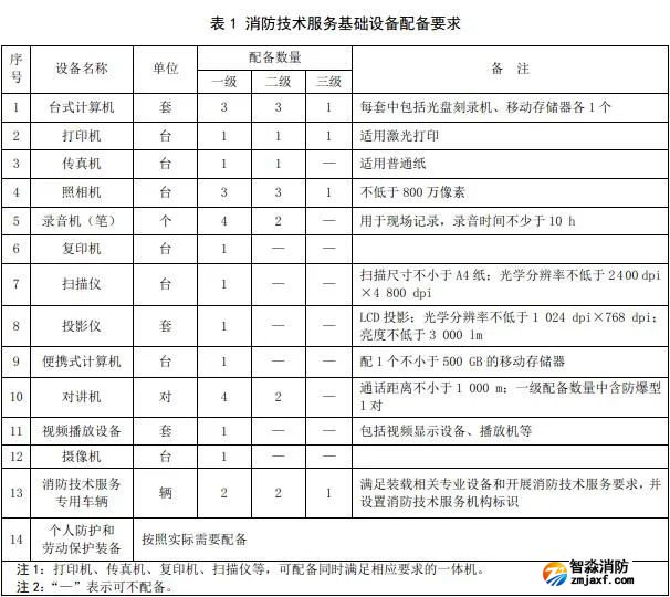 消防技術(shù)服務(wù)基礎(chǔ)設(shè)備為各類消防技術(shù)服務(wù)機(jī)構(gòu)應(yīng)配備的通用設(shè)備,應(yīng)符合消防技術(shù)服務(wù)數(shù)據(jù)處理、調(diào)查取證和從業(yè)人員個人防護(hù)的要求,設(shè)備的種類和數(shù)量至少應(yīng)滿足下表1的要求。
