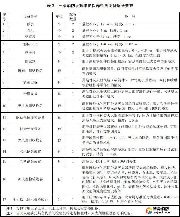三級消防設(shè)施維護(hù)保養(yǎng)檢測設(shè)備用于滅火器的檢查、維修、更換滅火劑及回收,其設(shè)備配備的種類和數(shù)量至少應(yīng)滿足下表3的要求。