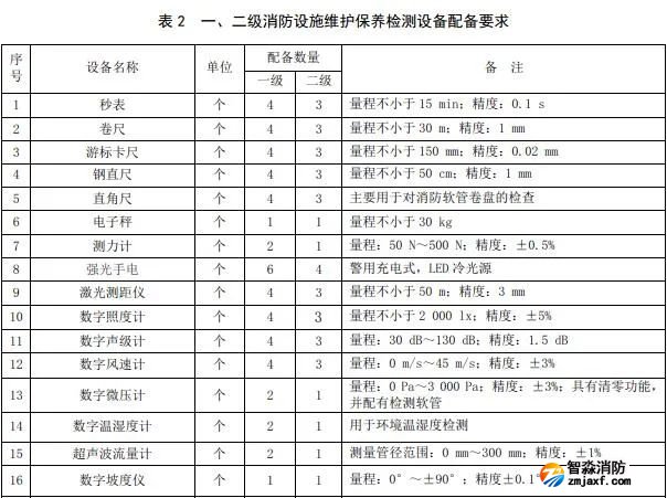 一級、二級消防設(shè)施維護(hù)保養(yǎng)檢測設(shè)備用于建筑消防設(shè)施的維護(hù)、保養(yǎng)和檢測,其設(shè)備配備的種類和數(shù)量至少應(yīng)滿足下表2的要求。