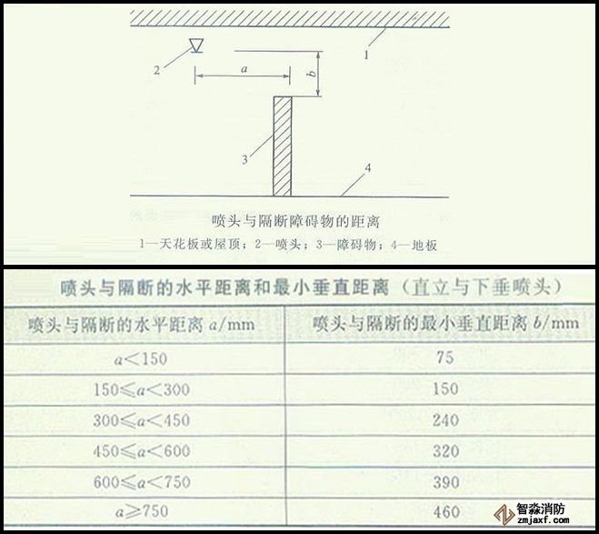 · 當(dāng)噴頭安裝在不到頂?shù)母魯喔浇鼤r,噴頭與隔斷的水平距離和最小垂直距離應(yīng)符合下表的規(guī)定: