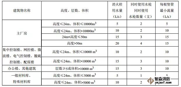 火力發(fā)電廠為工業(yè)建筑,為了便于操作,根據(jù)各建筑的內(nèi)部情況和火災危險性,明確了設(shè)置室內(nèi)消火栓的建筑物和場所。見表4。在電氣控制樓等帶電設(shè)備區(qū),應(yīng)配置噴霧水槍,增強消防人員的安全性。