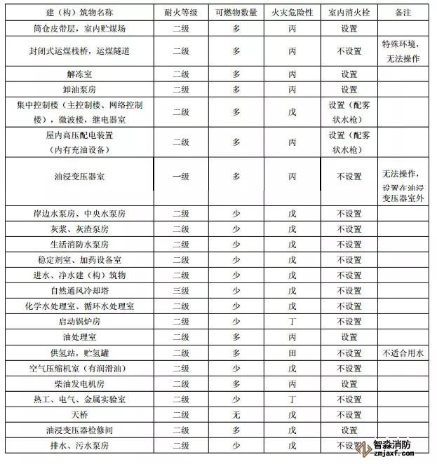 脫硫工藝樓,增壓風機室,吸收塔,吸風機室,屋內(nèi)高壓配電裝置(無油),除塵構(gòu)筑物,運煤棧橋,運煤隧道,油浸變壓器檢修間,油浸變壓器室,供、卸油泵房,油處理室,岸邊水泵房、中央水泵房,灰漿、灰渣泵房,生活消防水泵房,穩(wěn)定劑室、加藥設(shè)備室,進水、凈水構(gòu)筑物,冷卻塔,化學水處理室,循環(huán)水處理室,啟動鍋爐房,供氫站,推煤機庫,消防車庫,貯氫罐,空氣壓縮機室(有潤滑油),熱工、電氣、金屬實驗室,天橋,排水、污水泵房,各分場維護間,污水處理構(gòu)筑物,電纜隧道,材料庫棚,機車庫,警衛(wèi)傳達室。