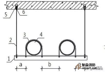 1.支架橫擔 2.鍍鋅螺桿 3.管碼 4.管道 5.頂爆螺栓 6.緊固螺栓
