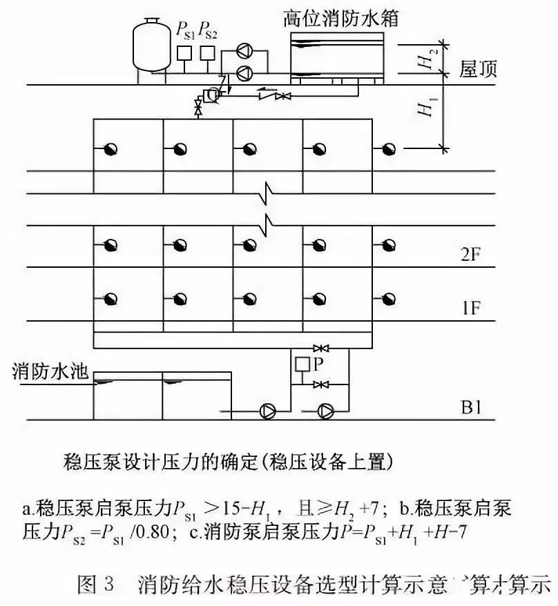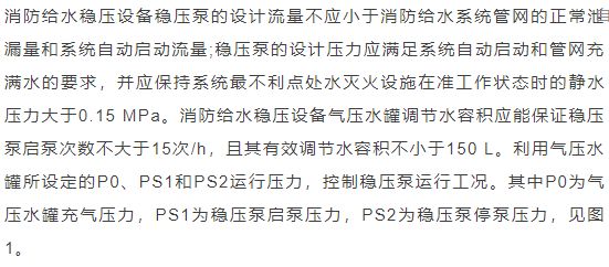 臨時高壓消防給水系統(tǒng)一般均應(yīng)設(shè)置高位消防水箱(除符合規(guī)范規(guī)定可不設(shè)的情形外),且對其設(shè)置高度有一定要求。日本規(guī)范規(guī)定自動噴水滅火系統(tǒng)屋頂消防水箱最不利的最低供水壓力為0.15 MPa,美國、英國規(guī)范則要求0.10 MPa。我國1987年版和2006年版“建規(guī)”對比均沒有規(guī)定,只在條文中要求重力自流的消防水箱應(yīng)設(shè)置在建筑的最高部位。1982年版《高層民用建筑設(shè)計規(guī)范》(以下簡稱“高規(guī)”)首次提出屋頂消防水箱應(yīng)滿足最不利消火栓的靜水壓力,但沒有提出設(shè)計參數(shù),1995年版“高規(guī)”做了具體規(guī)定。國標(biāo)圖集98S205編制目的是為解決臨時高壓消防給水系統(tǒng)高位消防水箱設(shè)置高度滿足不了系統(tǒng)最不利點靜水壓力時應(yīng)設(shè)增壓設(shè)施的要求,其為消防專用的增壓穩(wěn)壓設(shè)備的主要功能只是火災(zāi)初期時、消防主泵啟動前,確保具有足夠消防壓力的30 s儲水量進(jìn)行初期火災(zāi)撲救,直至消防主泵全負(fù)荷啟動運行。這里更多的還是強調(diào)增壓的概念,設(shè)備類似于氣壓供水,發(fā)揮主要作用的是氣壓水罐,穩(wěn)壓水泵的作用是在3 min內(nèi),補足氣壓水罐內(nèi)實際穩(wěn)壓水容積。利用氣壓水罐所設(shè)定的P1、P2、PS1和PS2運行壓力來控制穩(wěn)壓泵運行工況。P1為根據(jù)計算求得消火栓系統(tǒng)或自動噴水滅火系統(tǒng)中最不利點所需的消防壓力作為氣壓水罐的充氣壓力。平時管道系統(tǒng)如有滲漏泄壓等情況,控制穩(wěn)壓水泵不斷補水穩(wěn)壓,在PS1、PS2(啟動-停止)反復(fù)運行,一旦有火情,管道系統(tǒng)大量缺水,造成PS1下降(PS1→P2),降至P2時,立即啟動消防主泵。